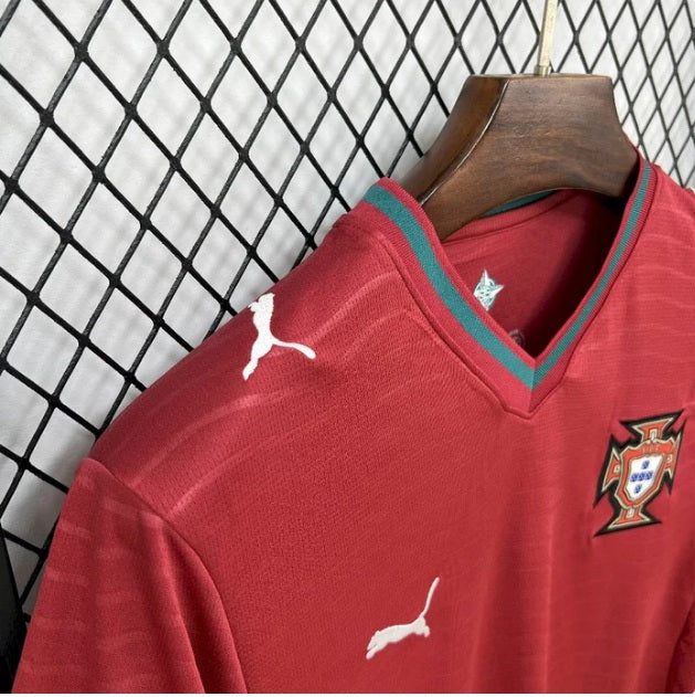 A gola em formato “Y” com corte em V inclui pormenores em verde, também presentes nos punhos, reforçando a ligação à bandeira nacional. O escudo da Federação Portuguesa de Futebol encontra-se bordado no peito, enquanto os logótipos da PUMA surgem em branco, conferindo um acabamento moderno e equilibrado.
